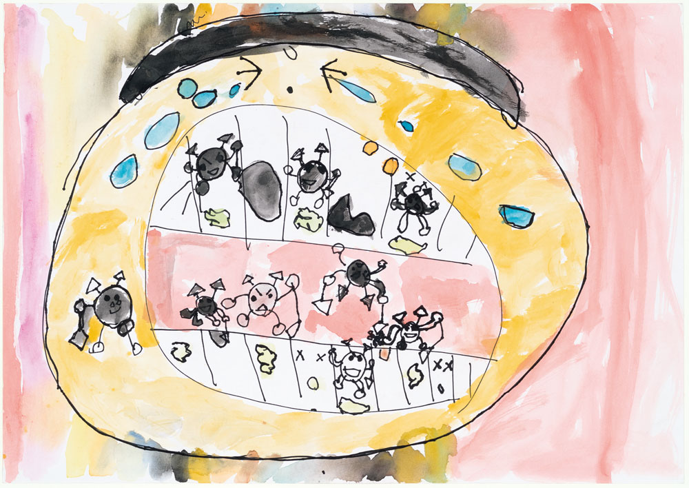 | 「むし歯の虫」に攻撃されて、悲鳴をあげ、泣いているところです。むし歯の虫は見えないはずですが、はるやさんにはこのように見えるのでしょう。ドラマを感じさせる画面になっていて、歯を綺麗にすることの大切さがよく伝わってきます。 |