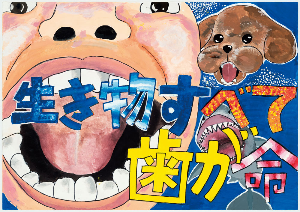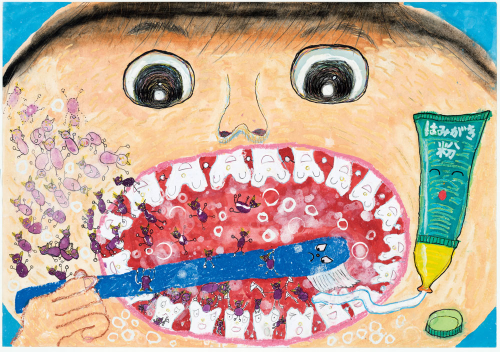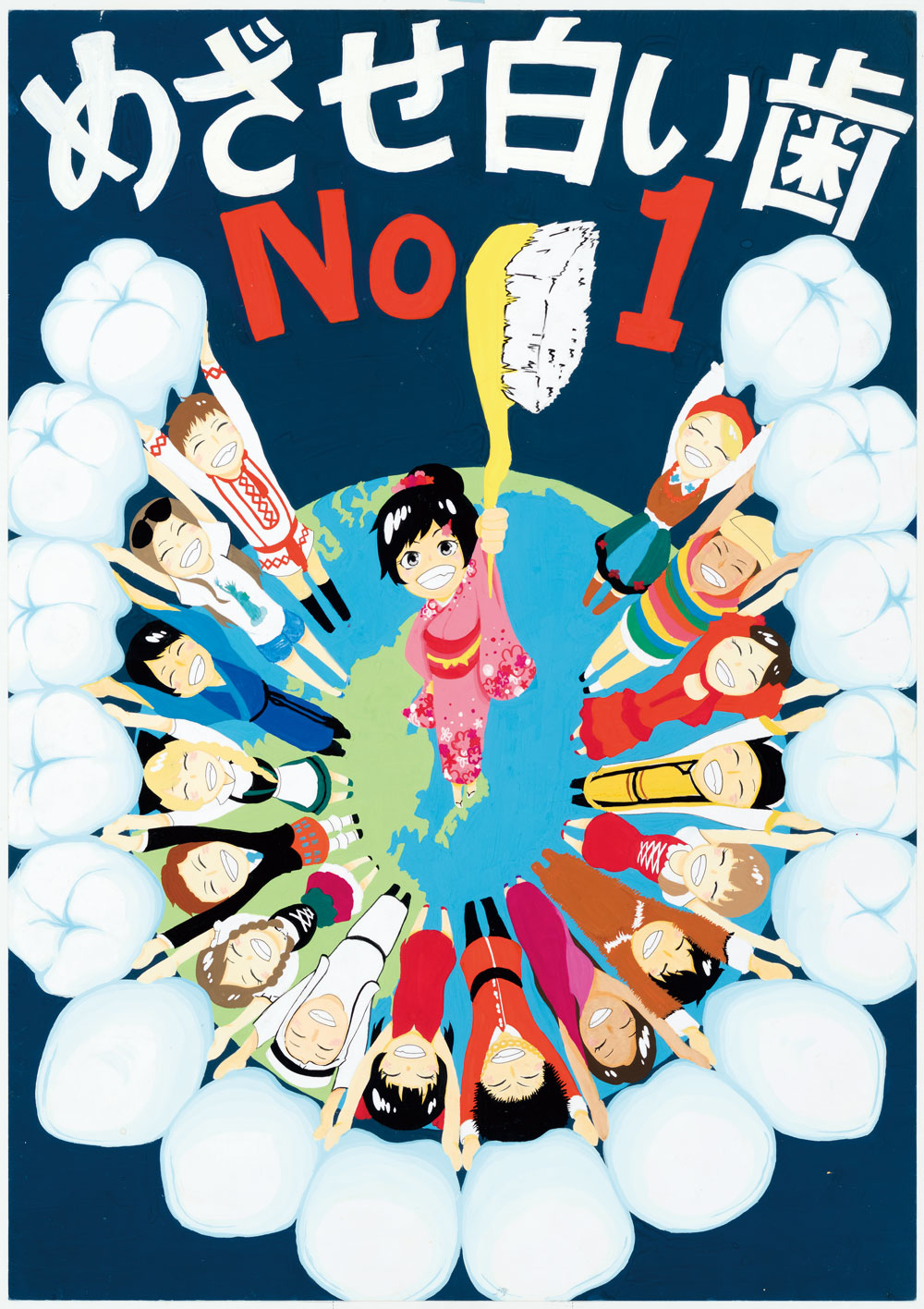 | 「世界中の人が、白い歯を目指す」というアイディアはすばらしいですね。人物のそれぞれの服装も、丁寧に、うまく描かれています。色彩もたいへん美しいです。欲を言えば、白い色が少し目立ち過ぎた、ということでしょうか。 |