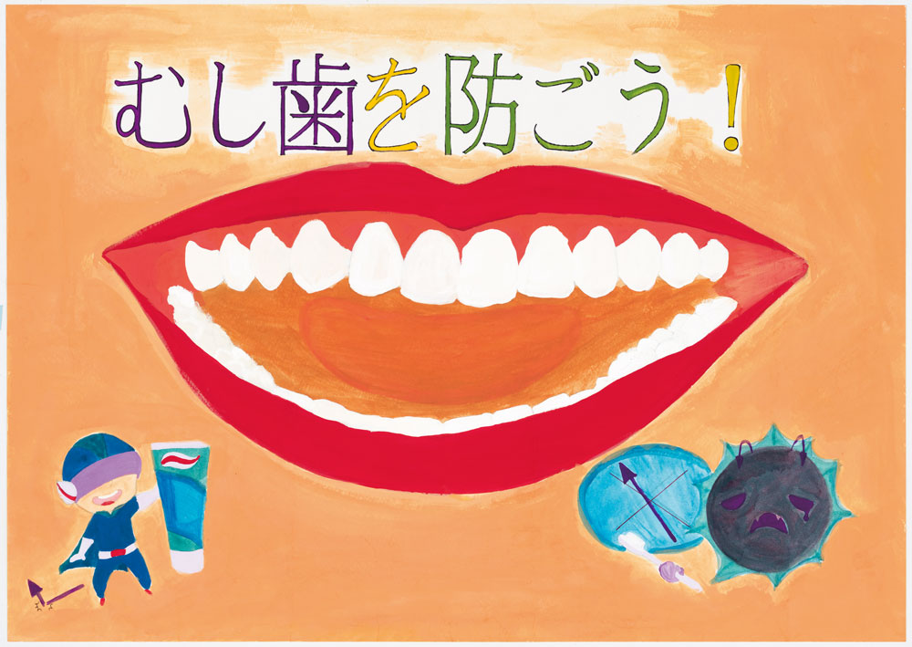 | 「むし歯を防ごう!」という標語と口に歯だけの絵、といったシンプルさが目立ち、まずここに目がいきます。次に、左下に描かれた歯みがきチューブを持った「正義の味方」が右下の「むし歯菌」をやっつける、という展開でしょうか。 |