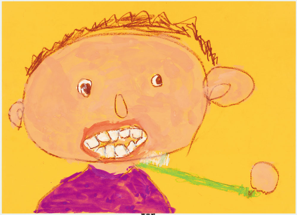| 白い歯がしっかりと描かれているのが、まず目につきます。歯ブラシが口に入ろうとしているところでしょうか。顔、唇、歯、歯ブラシ、洋服などの色が美しいです。これらの色が全体としてうまく調和し、画面が構成されています。 |