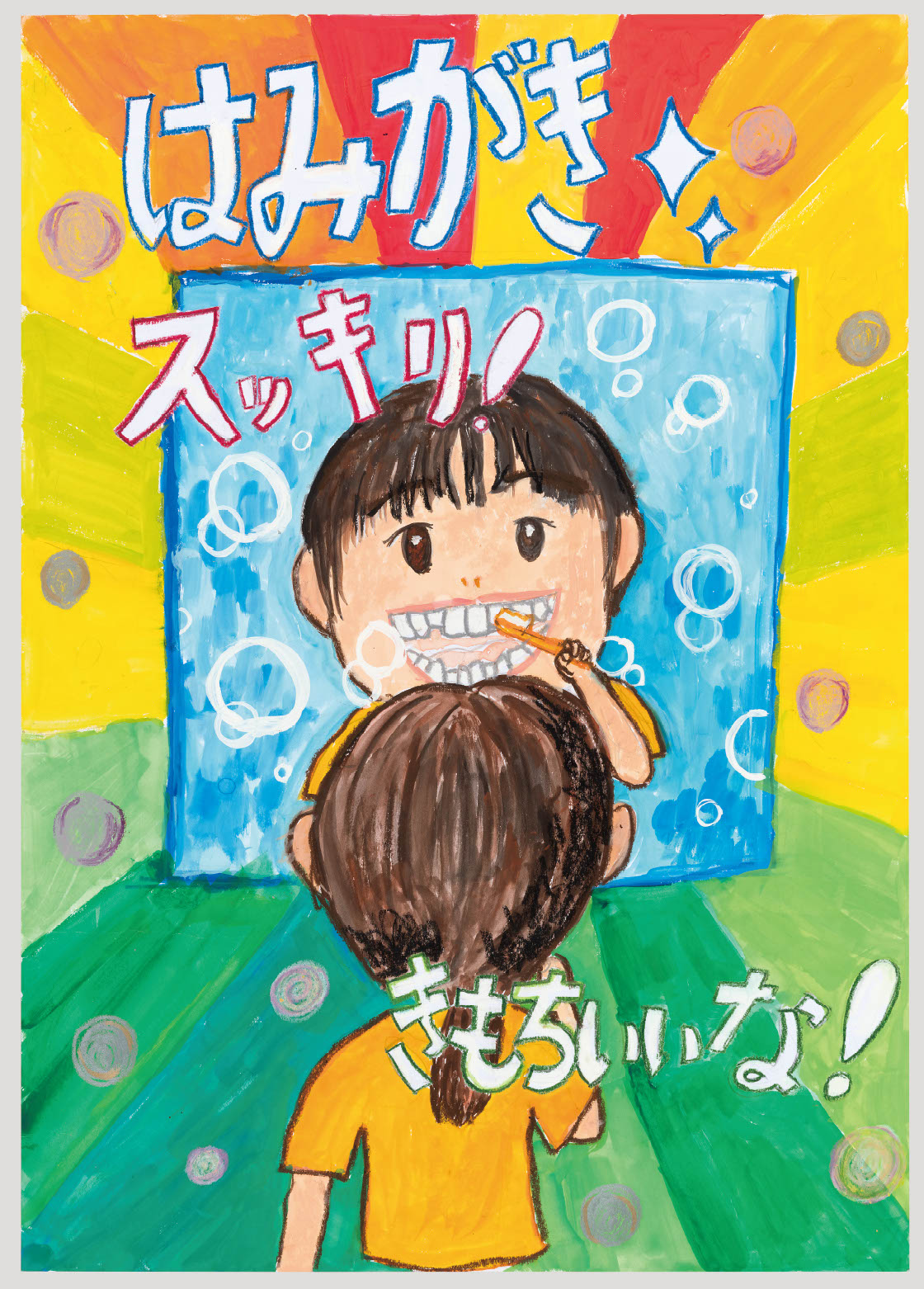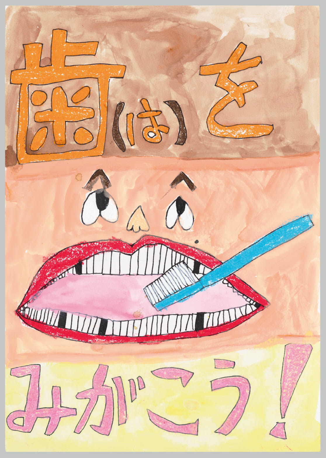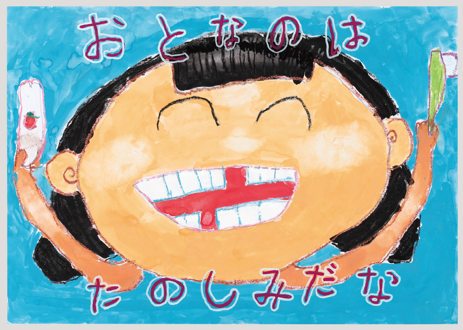 | 子どもらしいとても素直な感じのする作品です。上下1本ずつ歯がぬけていますが、これから生えてくる大人の歯を楽しみにしている気持ち、その歯も大切にしようという気持ちが、よく伝わってきます。配色もいいですね。 |