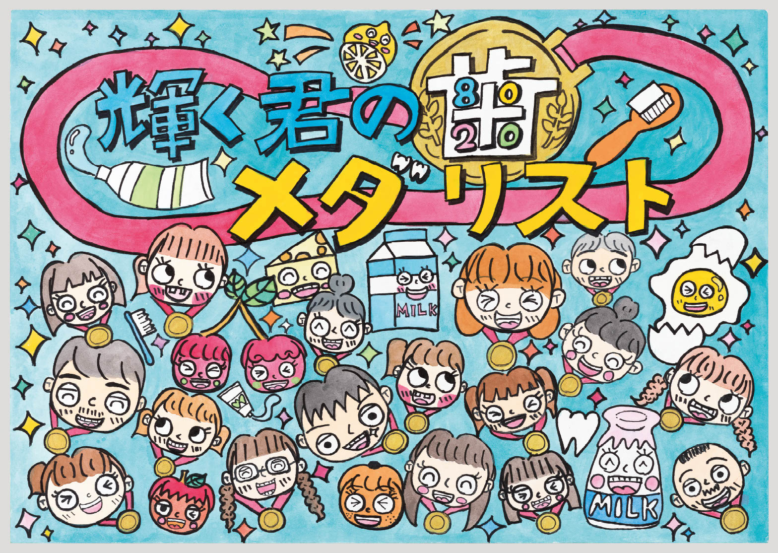 | 「輝く歯」と「メダル」とを結びつけた作品です。様々な子どもの顔、ミルクや卵など、それぞれが豊かな表情を持って輝いています。輝く歯、強い歯が誇りです。たくさんのものが描かれていますが、背景の青が全体をまとめています。 |