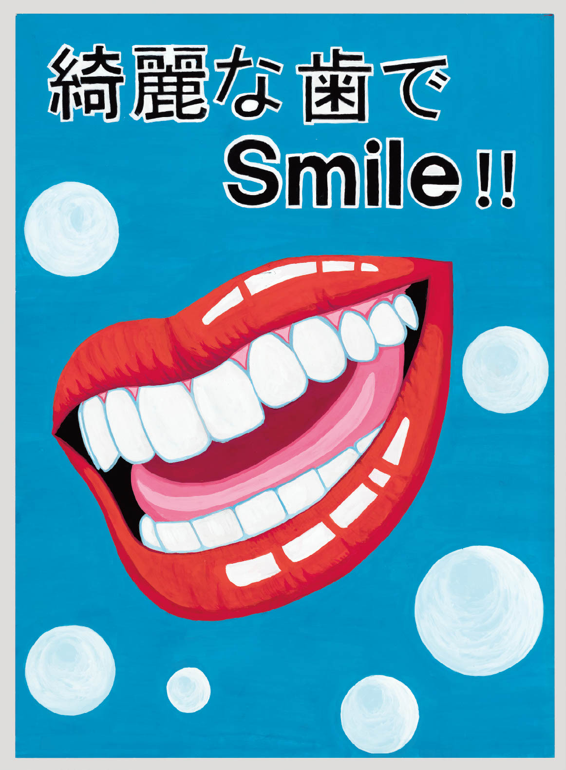 | まず、歯、口、が目に飛び込んできます。そして「綺麗な歯で Smile!!」と語り、歯を清潔に保つことの大切さを絵とともに訴えます。色彩的には、赤い口、青い背景、黒い文字、の中で「白い綺麗な歯」が強調されています。 |