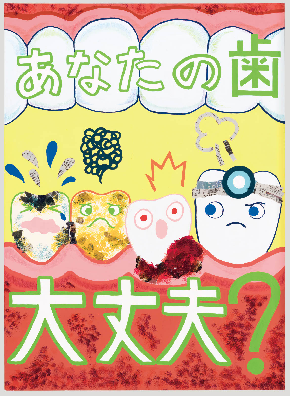 | むし歯、汚れた歯、病気の歯ぐきなどで悩む歯たちに、歯医者さん役の歯が「困った歯たち」と怒っています。治療される側もする側もみんな歯、というのが独創的ですね。そして、「あなたの歯大丈夫?」と問いかけています。 |