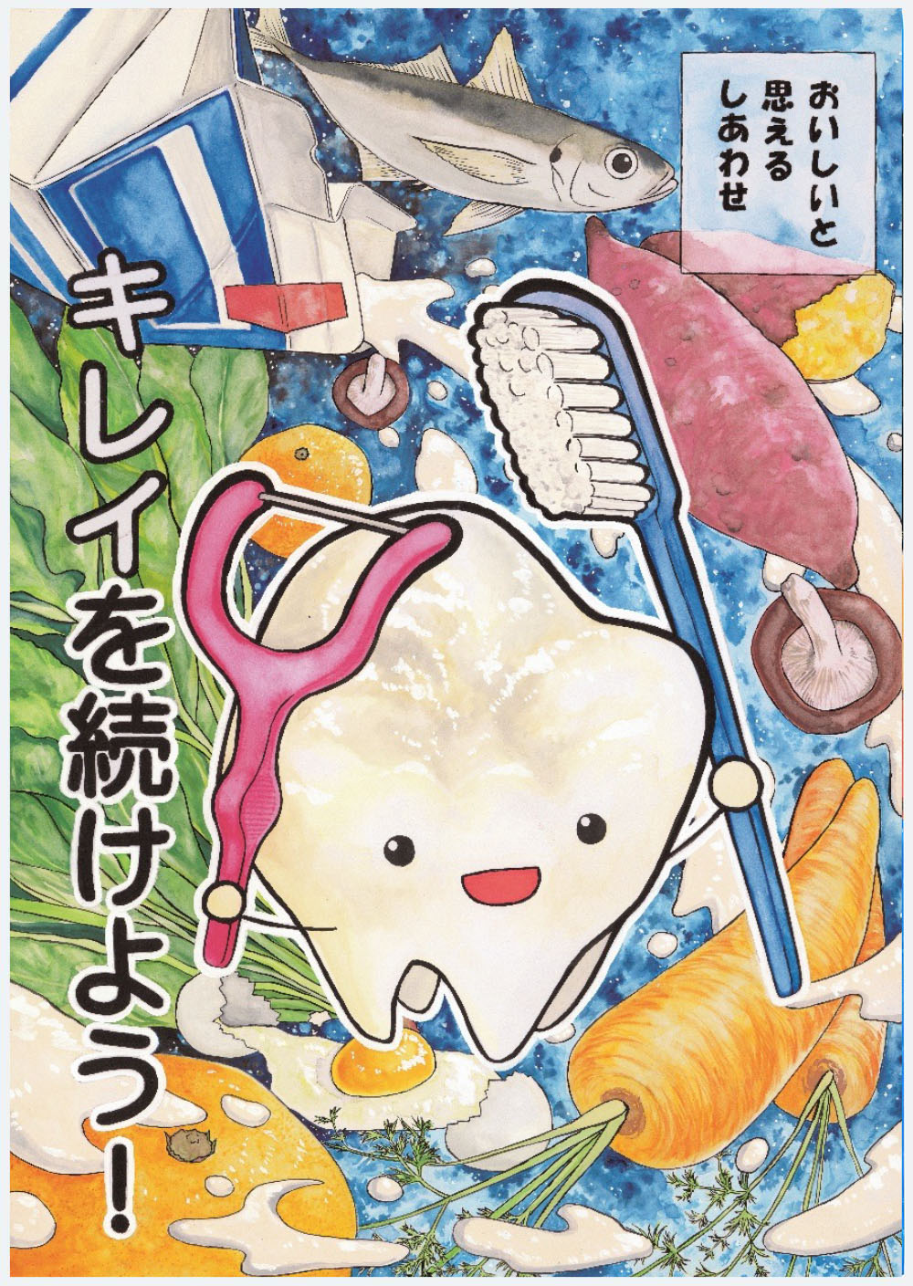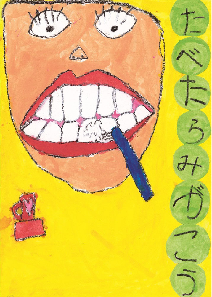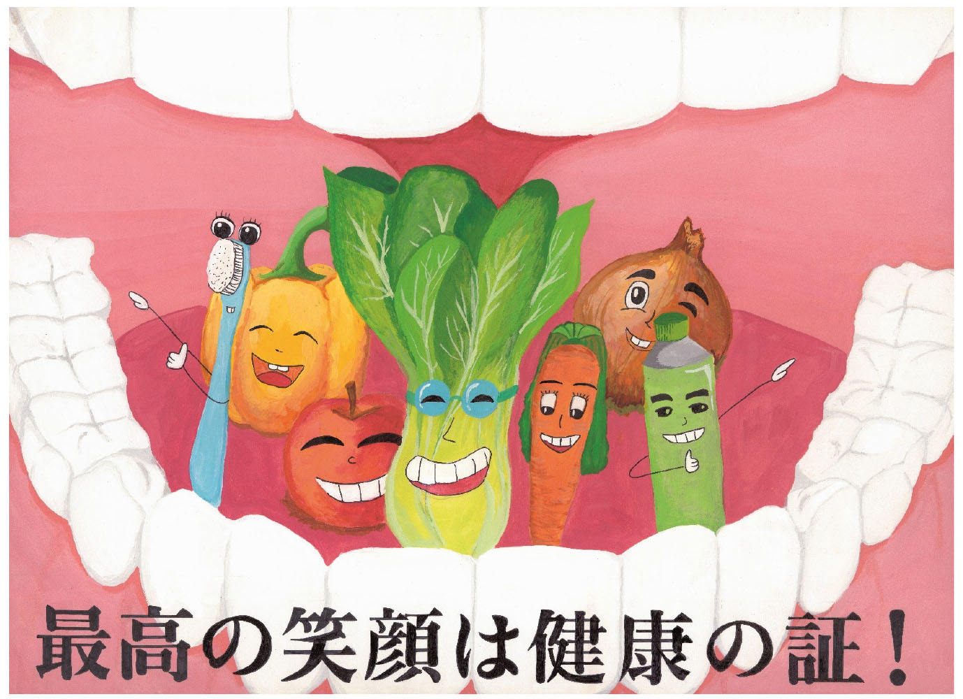 | 明るく歯科保健の重要性を伝え、アイデアに優れた色彩感覚豊かな作品だと思います。美しい歯並びの中に、様々な食材と歯ブラシ・歯みがきが笑顔で迎え入れてくれます。歯・口の健康が、全身の健康に欠かせないことを標語と共に語っています。 |