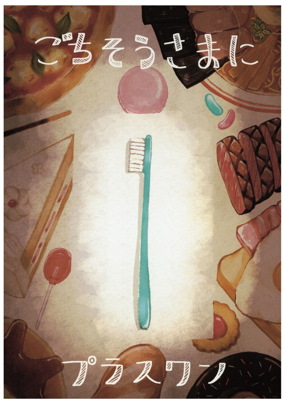| 「ごちそうさまに プラスワン」という標語、そして落ち着いた色彩を用いた造形は、高校生らしい作品です。美味しそうな食べ物がいっぱい並び、それらを食べた後に一本の歯ブラシをプラスワン。ここまでやって健康パーフェクト、と言いたいようです。 |