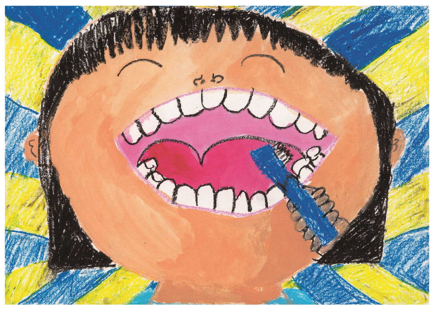| 「明るく、楽しく、歯をみがこう!」という感じが伝わってくる作品です。顔の表情でこうしたことがわかりますが、黄色と青の外に広がっていく背景の描き方がそれをさらに強調します。子どもらしく、のびのびと、歯みがきの大切さを伝えてくれます。 |
