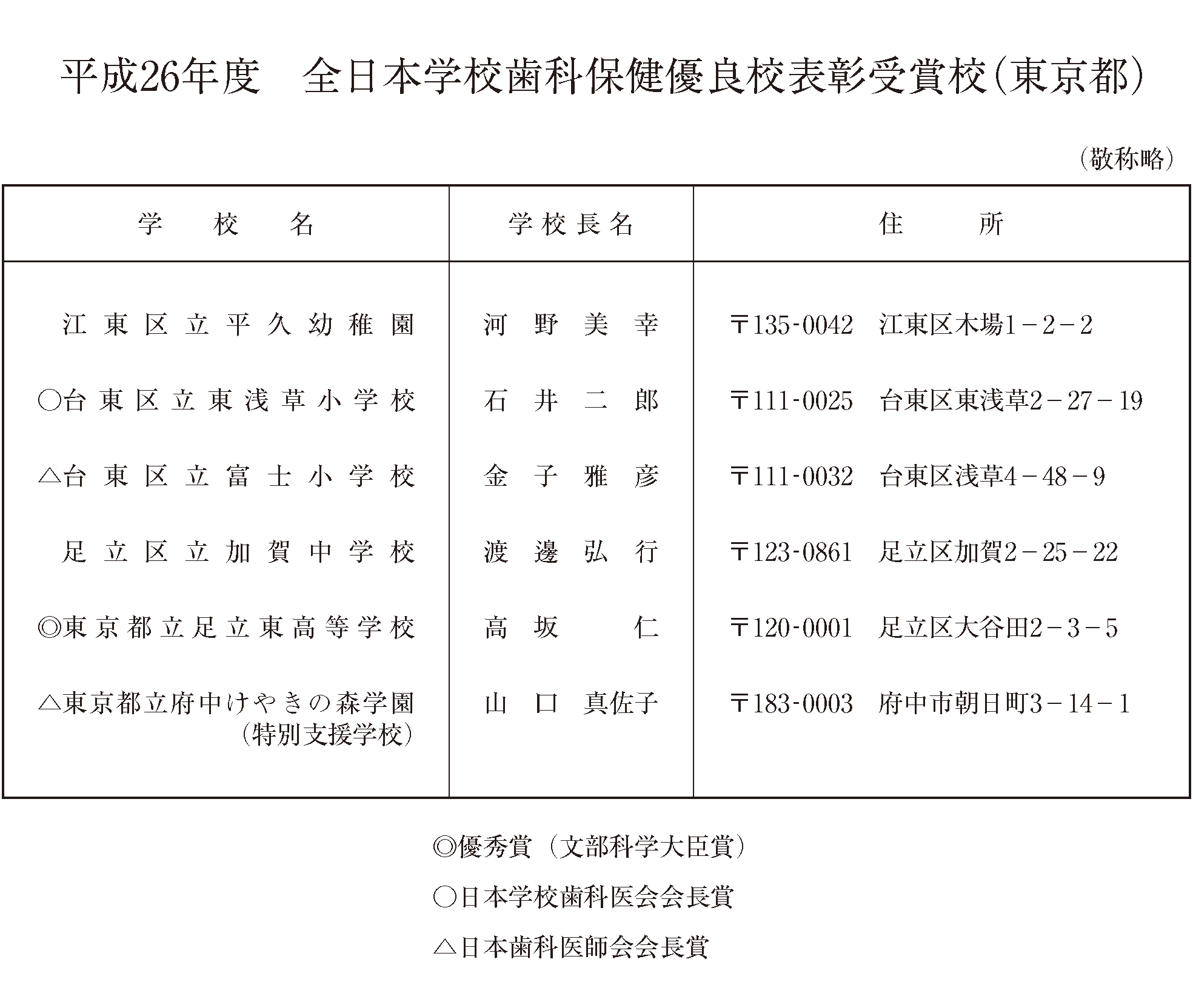 平成26年度全日本学校歯科保健優良校表彰受賞校(東京都)