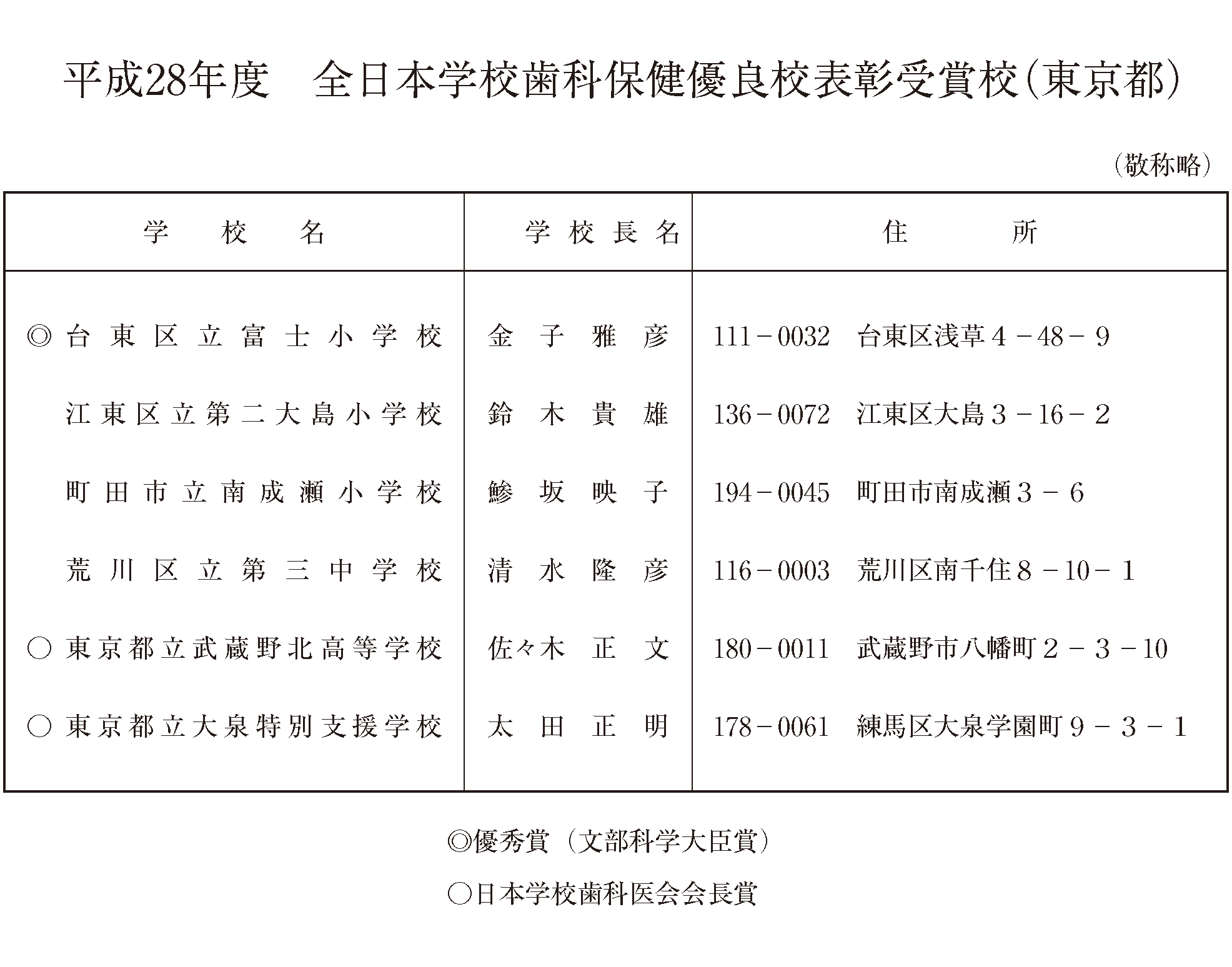 平成28年度全日本学校歯科保健優良校表彰受賞校(東京都)