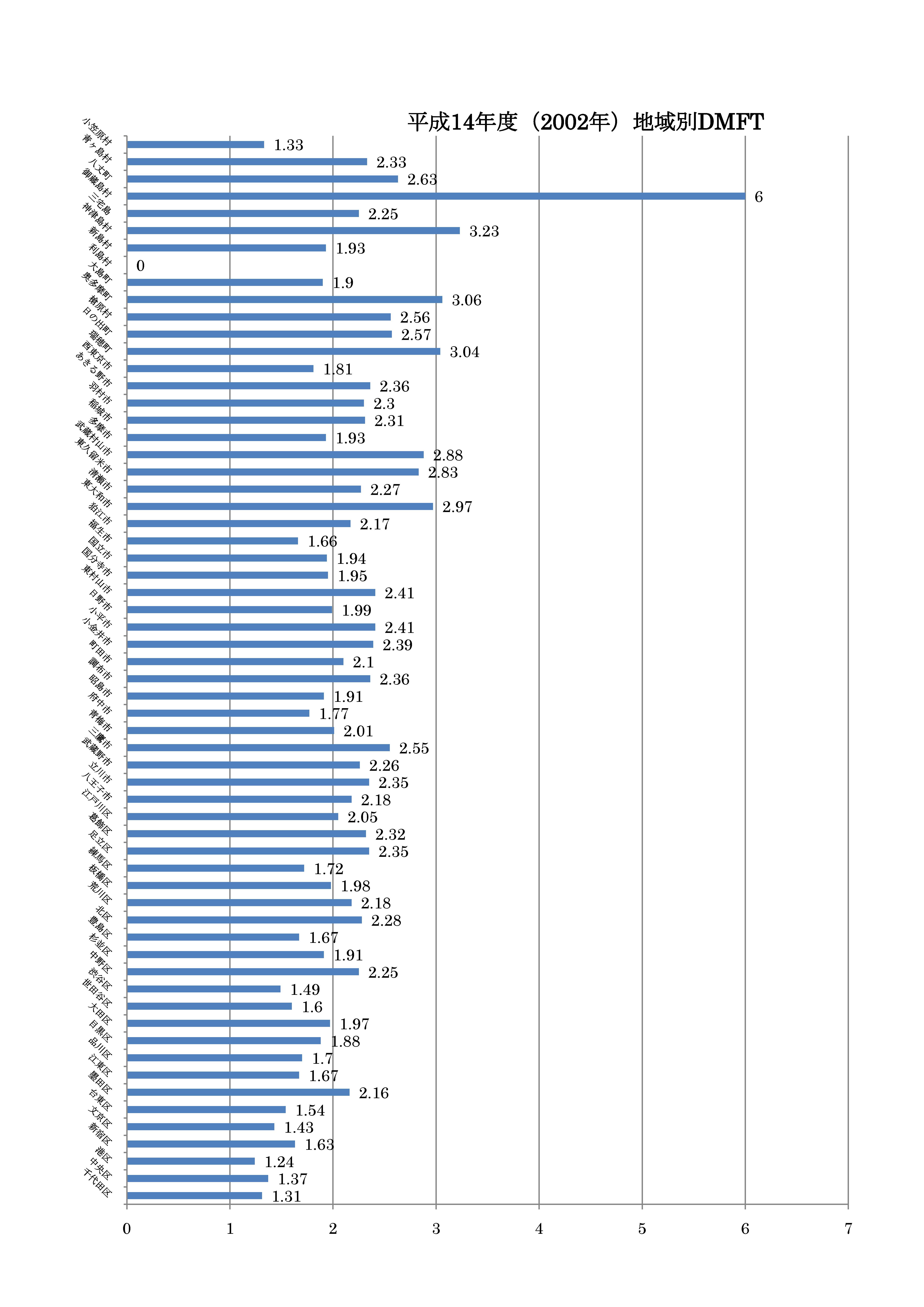 | 下記は『平成14年度東京都の学校保健統計書(永久歯のむし歯(う蝕)の状況)』(小学校6年から中学校1年)のデータから中学1年の数値を抽出しグラフ化したものです。 |