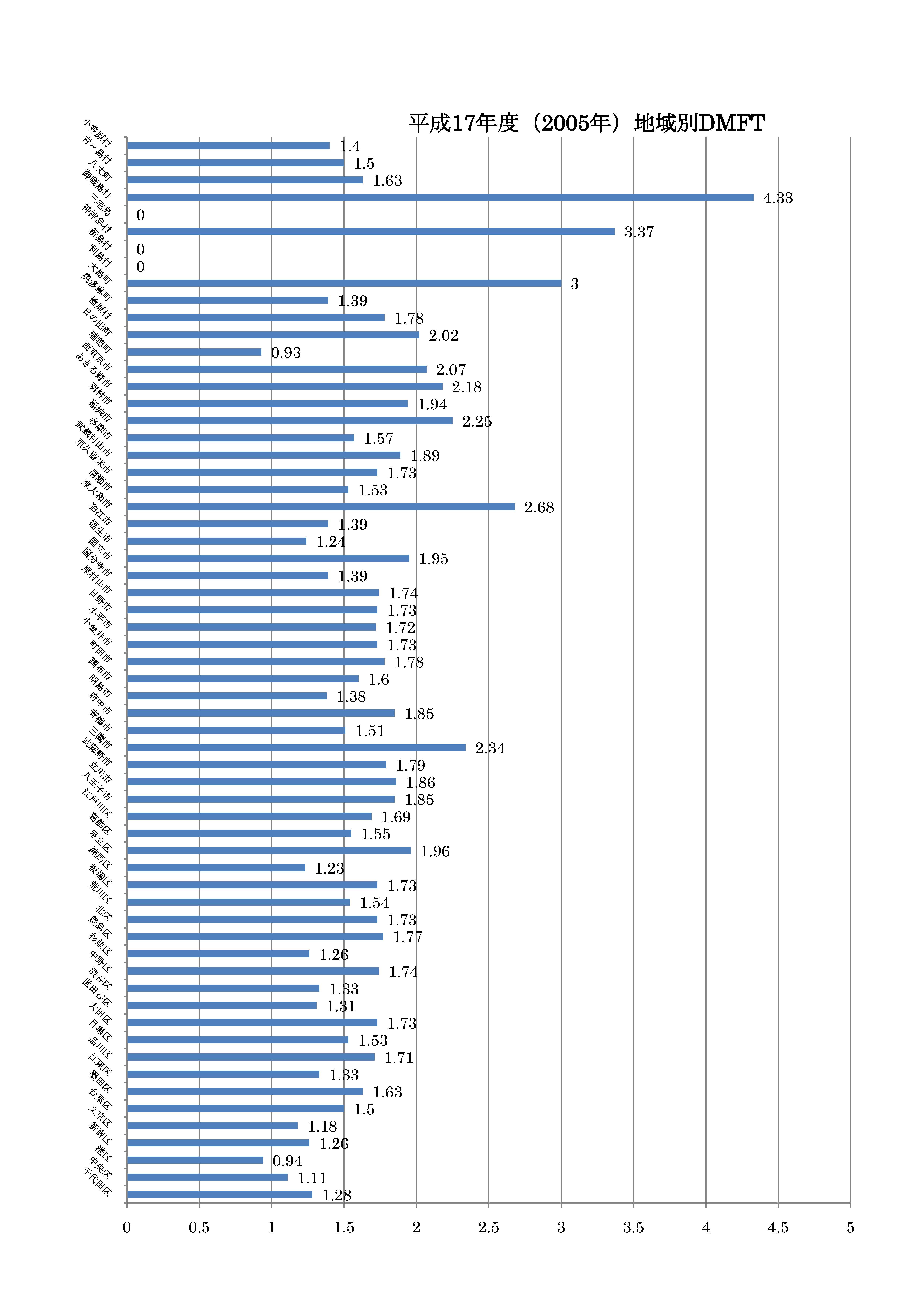 下記は『平成17年度東京都の学校保健統計書(永久歯のむし歯(う蝕)の状況)』(小学校6年から中学校1年)のデータから中学1年の数値を抽出しグラフ化したものです。