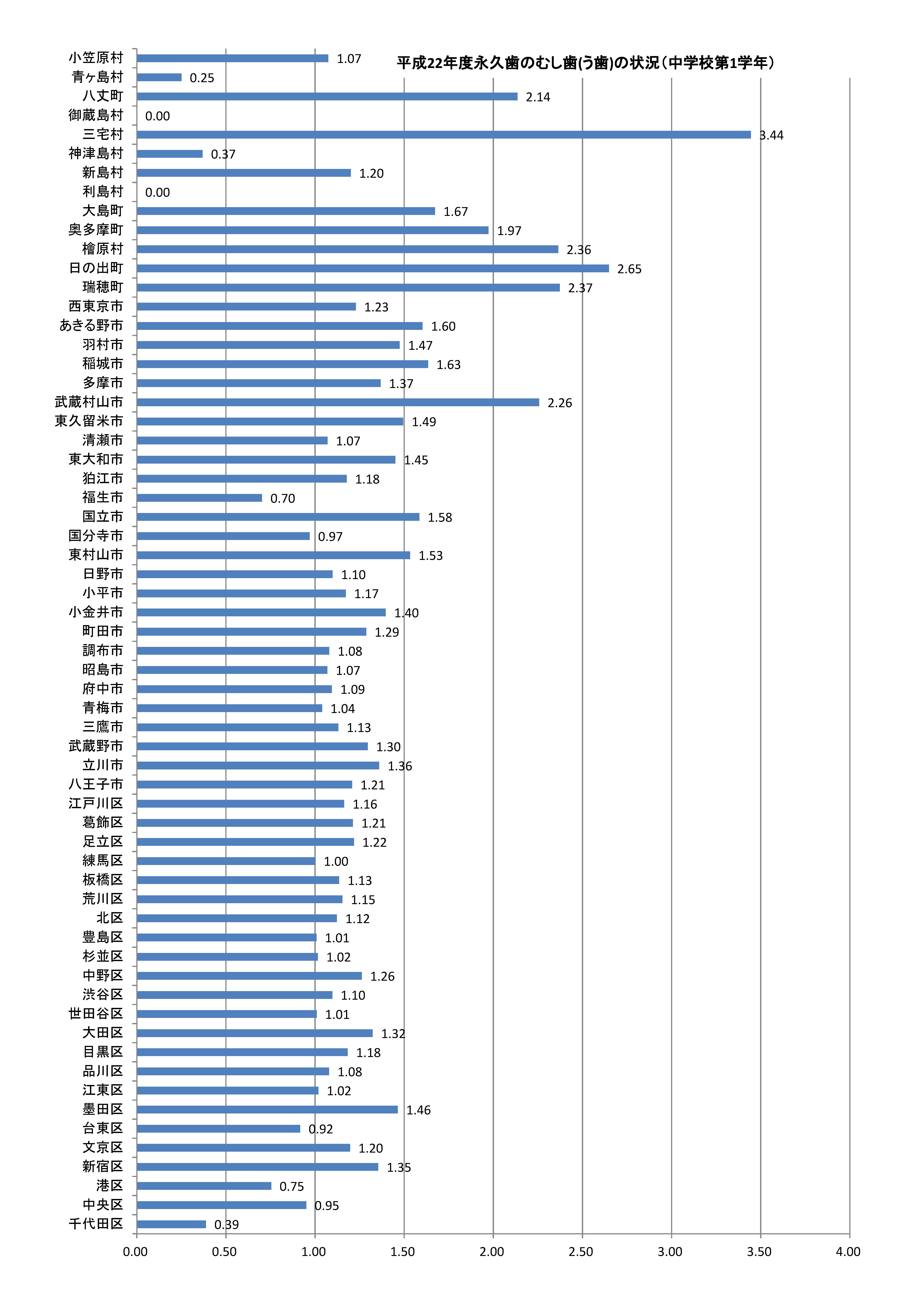 | 下記は『平成22年度東京都の学校保健統計書(永久歯のむし歯(う蝕)の状況)』(小学校6年から中学校1年)のデータから中学1年の数値を抽出しグラフ化したものです。 |