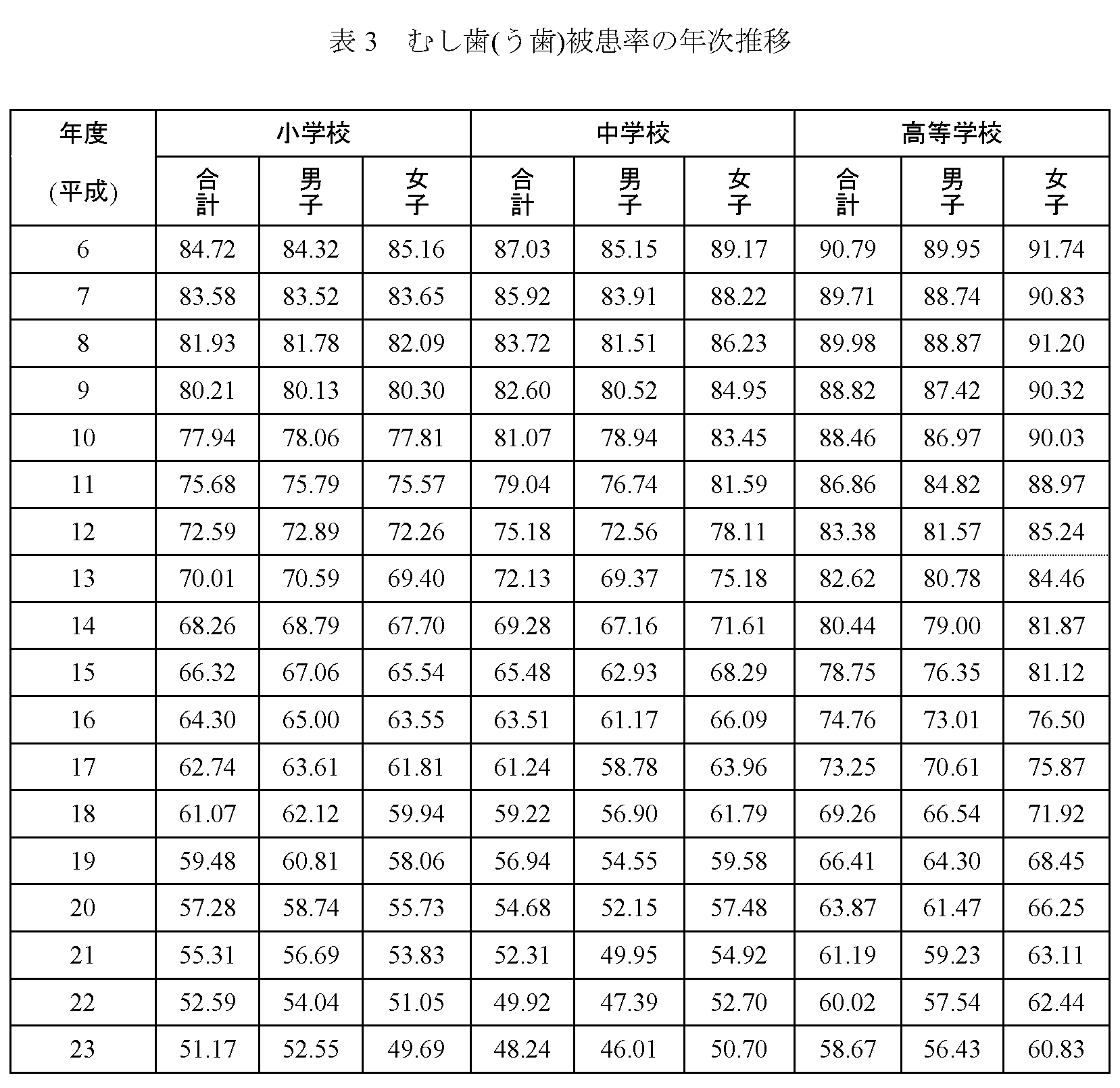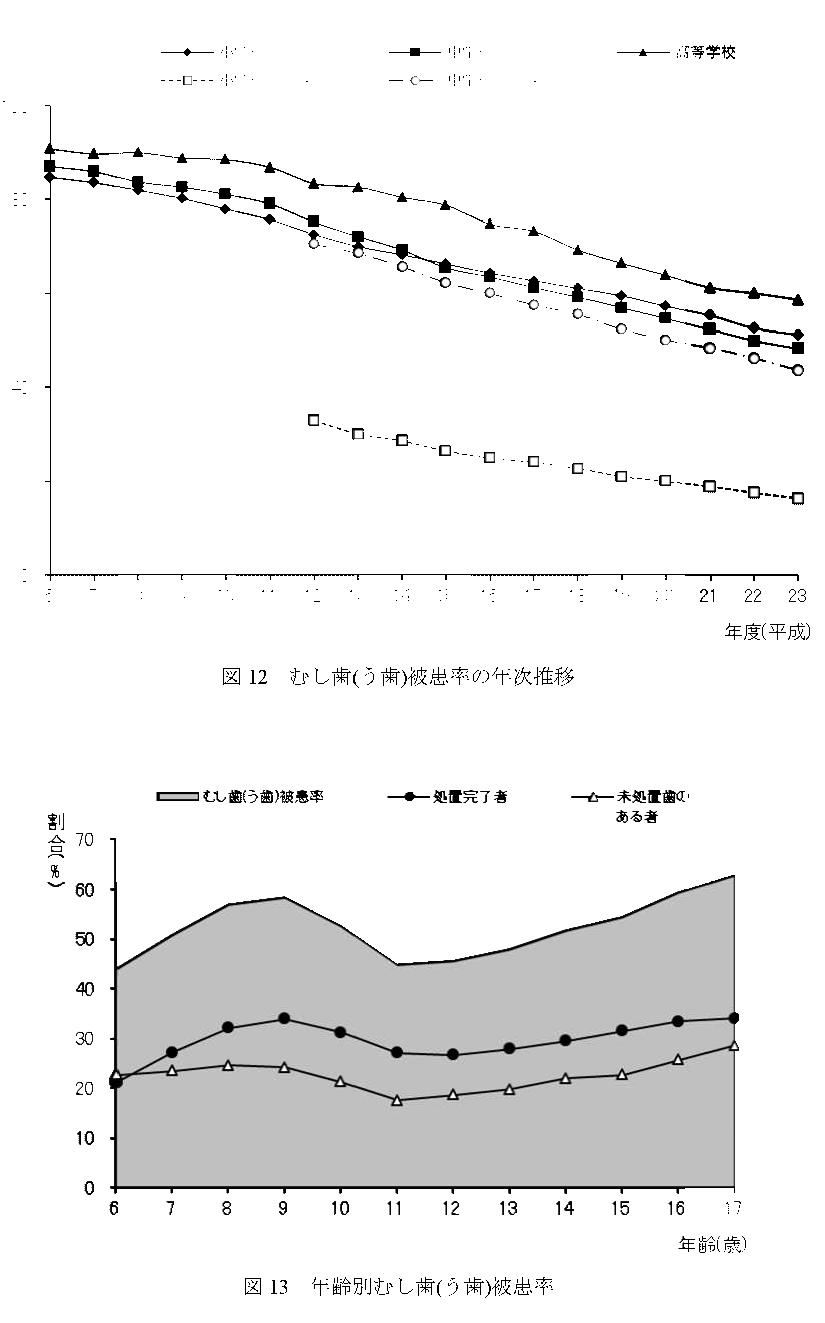 むし歯(う歯)被患率とは、むし歯(治療済みのむし歯を含む。) のある者の割合である。平成23年度のむし歯被患率は、小学校51.2%、中学校48.2%、高等学校58.7%であり、経年的には減少傾向が続いている。