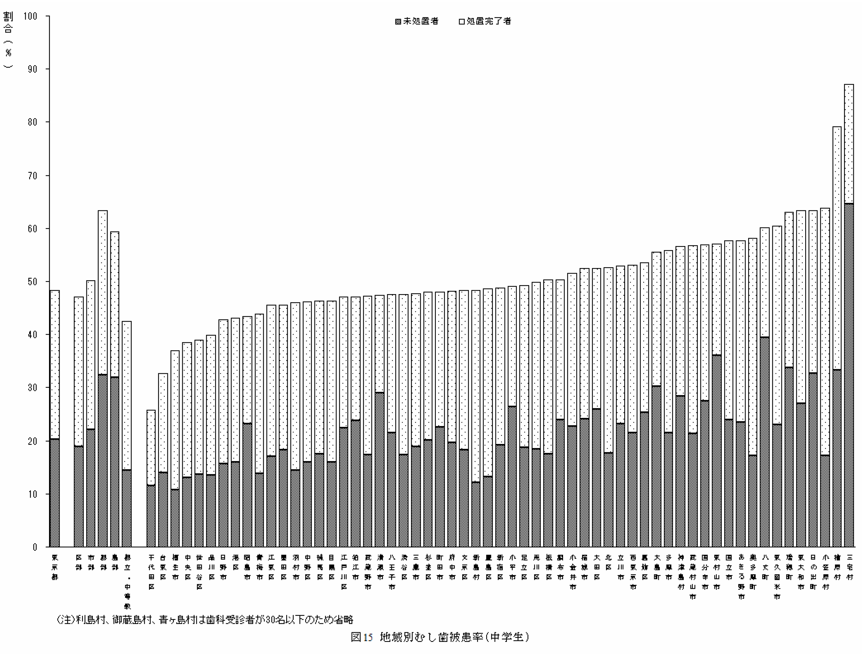 なお、むし歯(う歯)被患率は永久歯だけでなく、乳歯も合わせて集計している。図13 にて11歳の段階で被患率が減少するのは、乳歯から永久歯への生え変わりの影響によるものと考えられる。また、小学校の地域別のむし歯(う歯)被患率を図14 に、中学校の地域別のむし歯(う歯)被患率を図15 にそれぞれ示す。 |