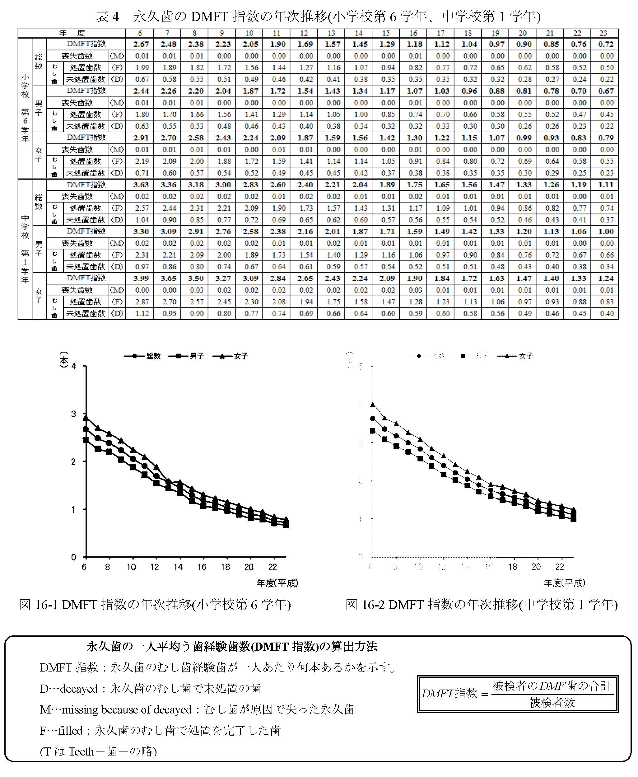 小学校第6 学年児童、中学校第1 学年生徒の永久歯の一人平均むし歯(う歯)経験歯数(DMFT 指数)について(表4、図16-1、図16-2、図17)