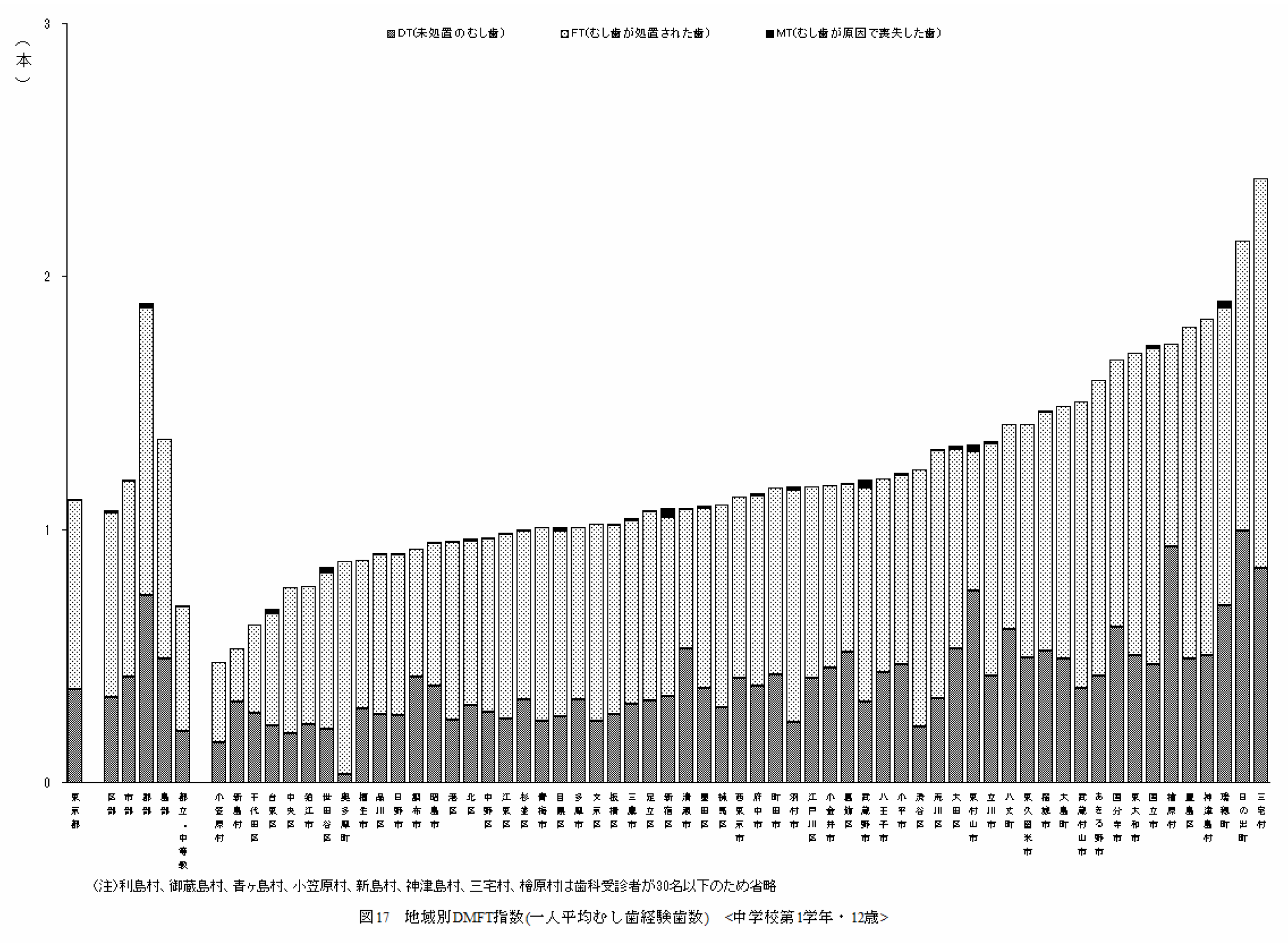 DMFT 指数は、小学校第6 学年、中学校第1 学年、いずれにおいても、男子に比較して、女子の方が高くなっている。また、地域別のDMFT 指数(中学校第1 学年)を図17 に示す。 |