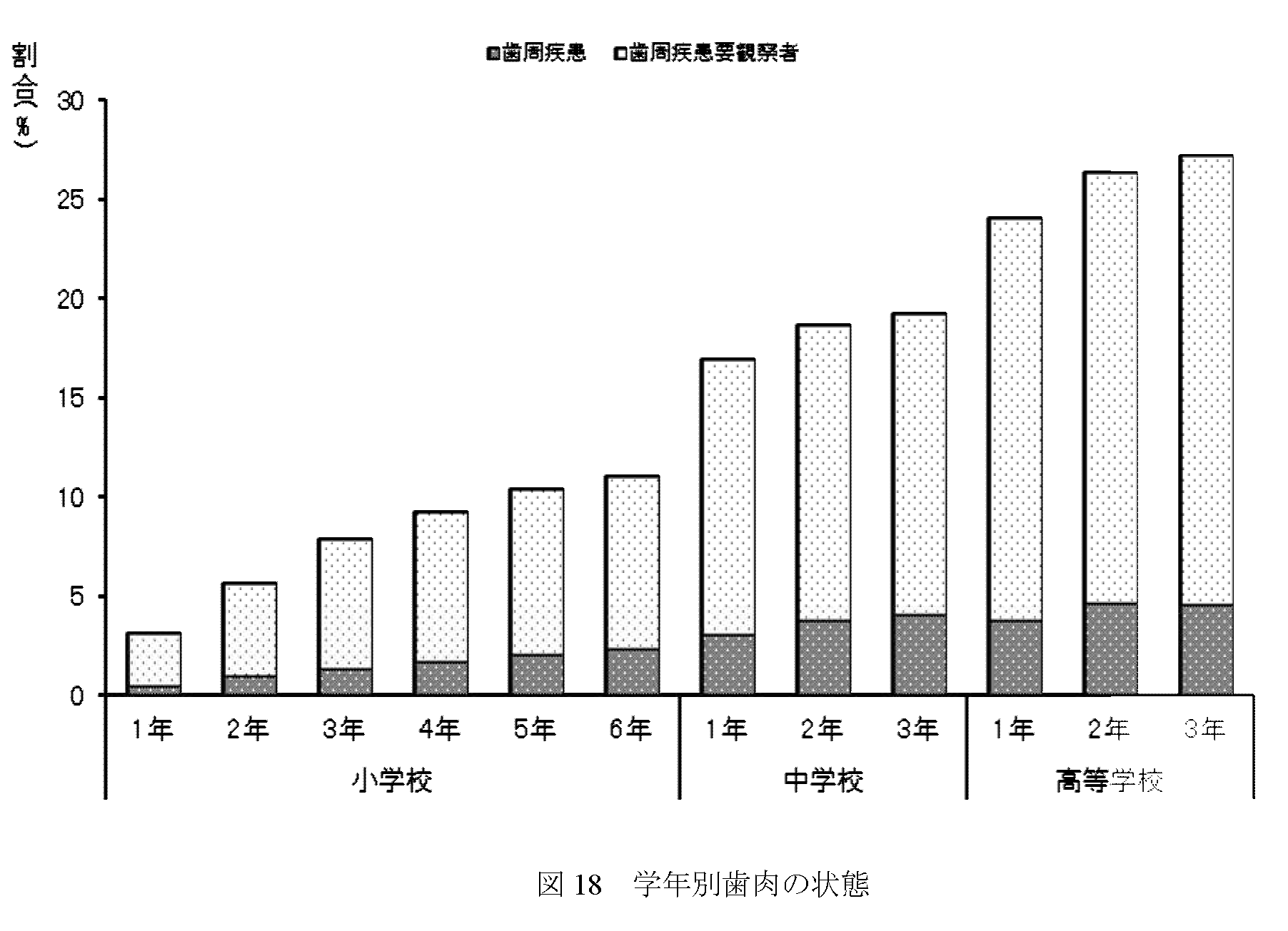 歯肉の状態を学年別にみると、歯周疾患及び歯周疾患要観察者の割合は学年が進むに従って高くなっている。 |