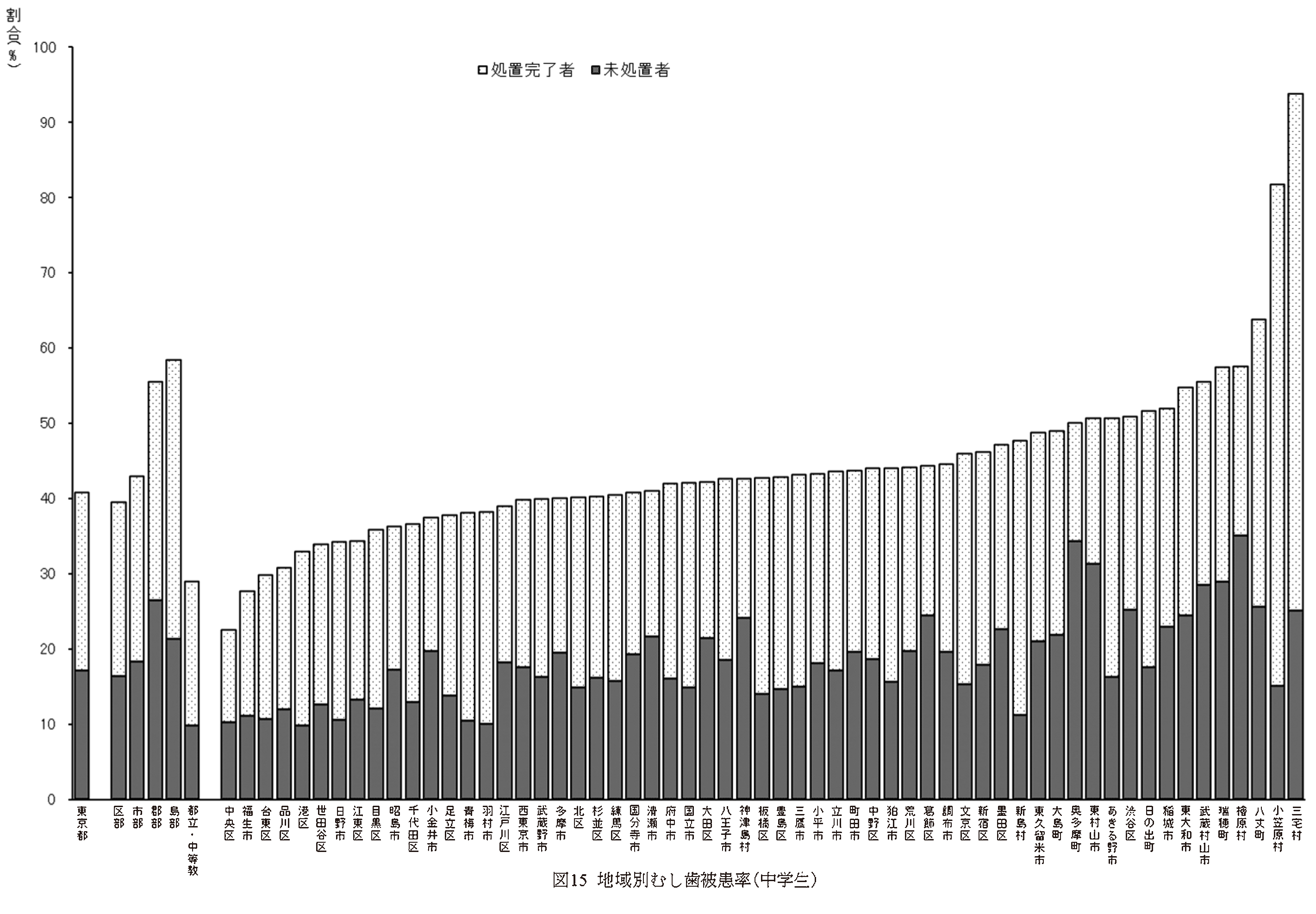 なお、むし歯(う歯)被患率は永久歯だけでなく、乳歯も合わせて集計している。図13 にて11歳の段階で被患率が減少するのは、乳歯から永久歯への生え変わりの影響によるものと考えられる。また、小学校の地域別のむし歯(う歯)被患率を図14 に、中学校の地域別のむし歯(う歯)被患率を図15 にそれぞれ示す。
