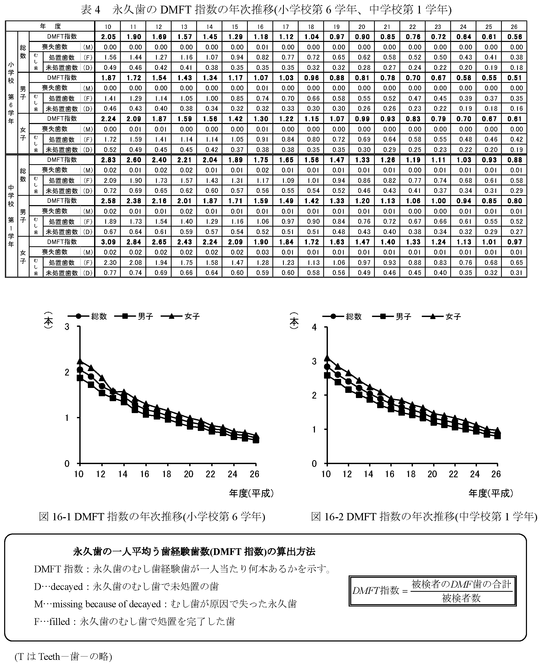 小学校第6 学年児童、中学校第1 学年生徒の永久歯の一人平均むし歯(う歯)経験歯数(DMFT 指数)について(表4、図16-1、16-2、図17)