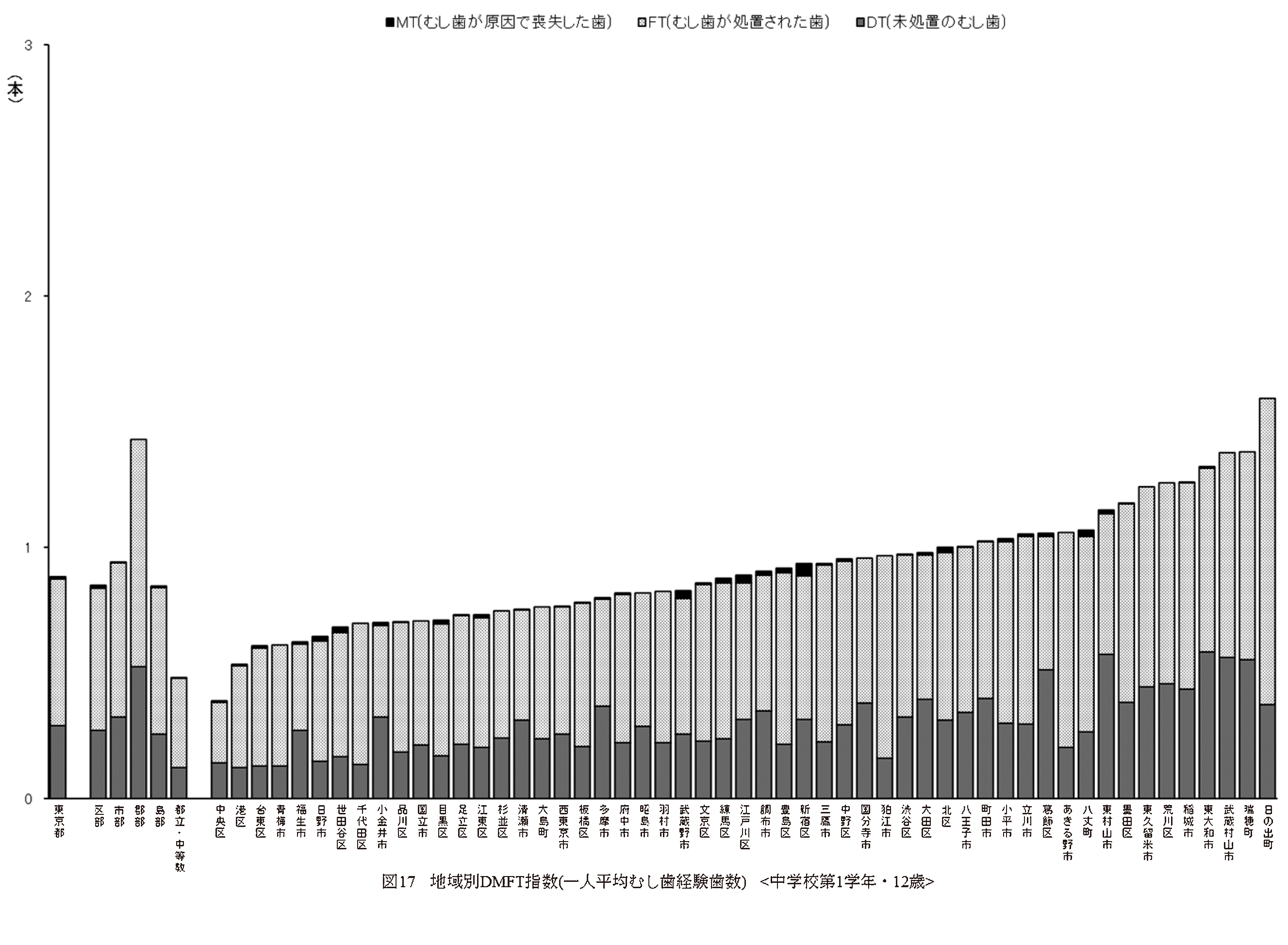 DMFT 指数は、小学校第6 学年、中学校第1 学年、いずれにおいても、男子に比較して、女子の方が高くなっている。また、地域別のDMFT 指数(中学校第1 学年)を図17 に示す。