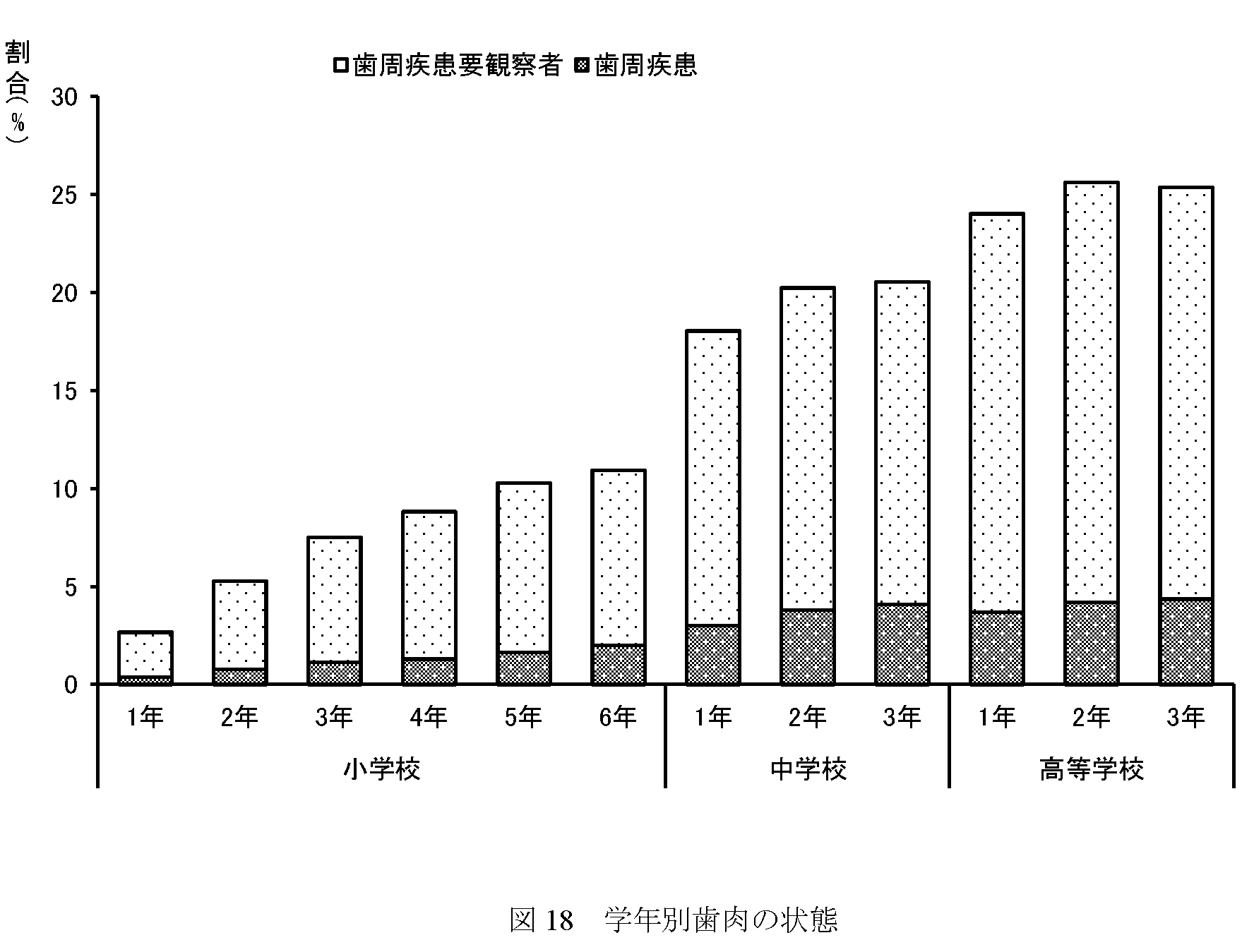 歯肉の状態を学年別にみると、歯周疾患及び歯周疾患要観察者の割合は学年が進むに従って高くなっている。