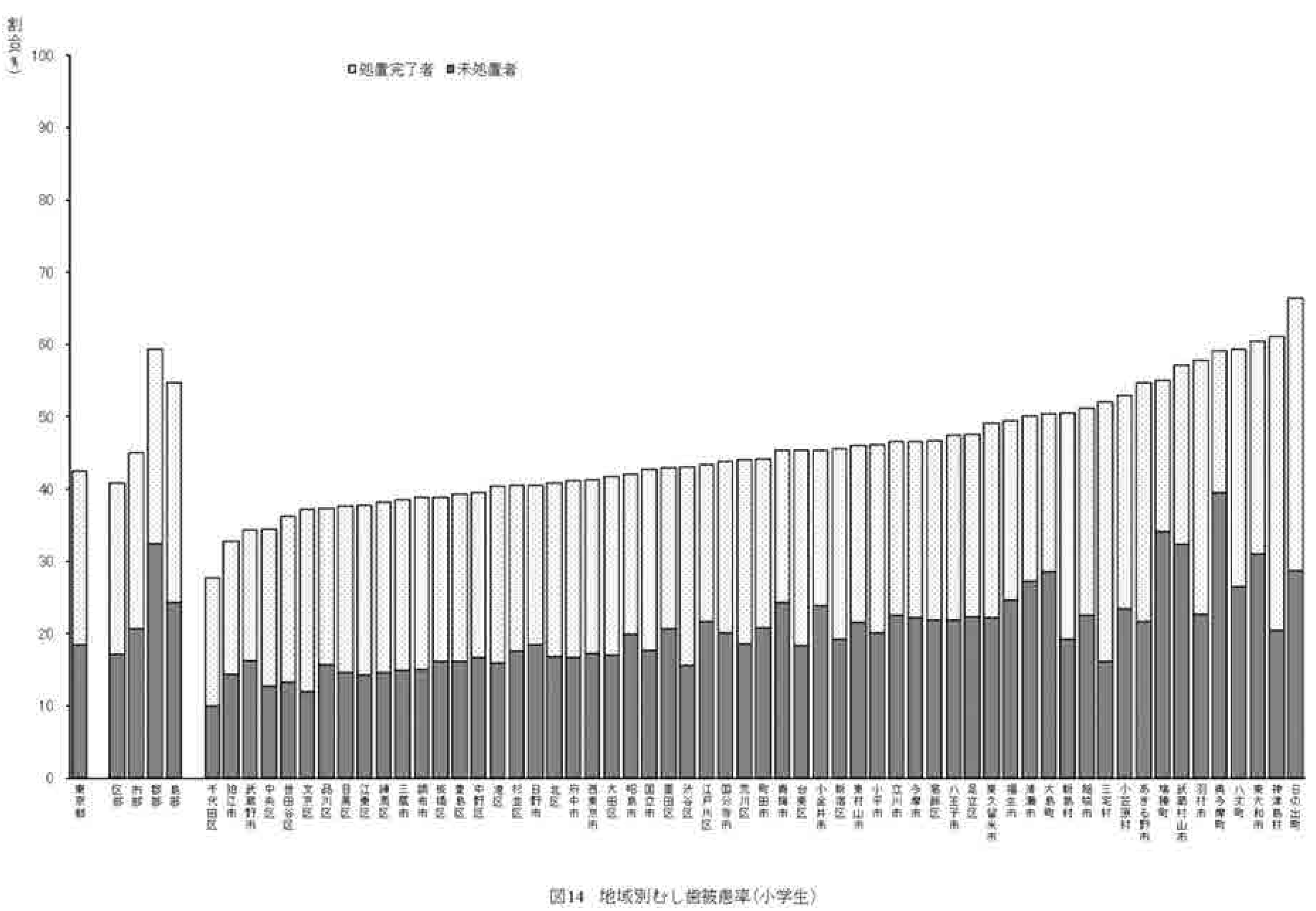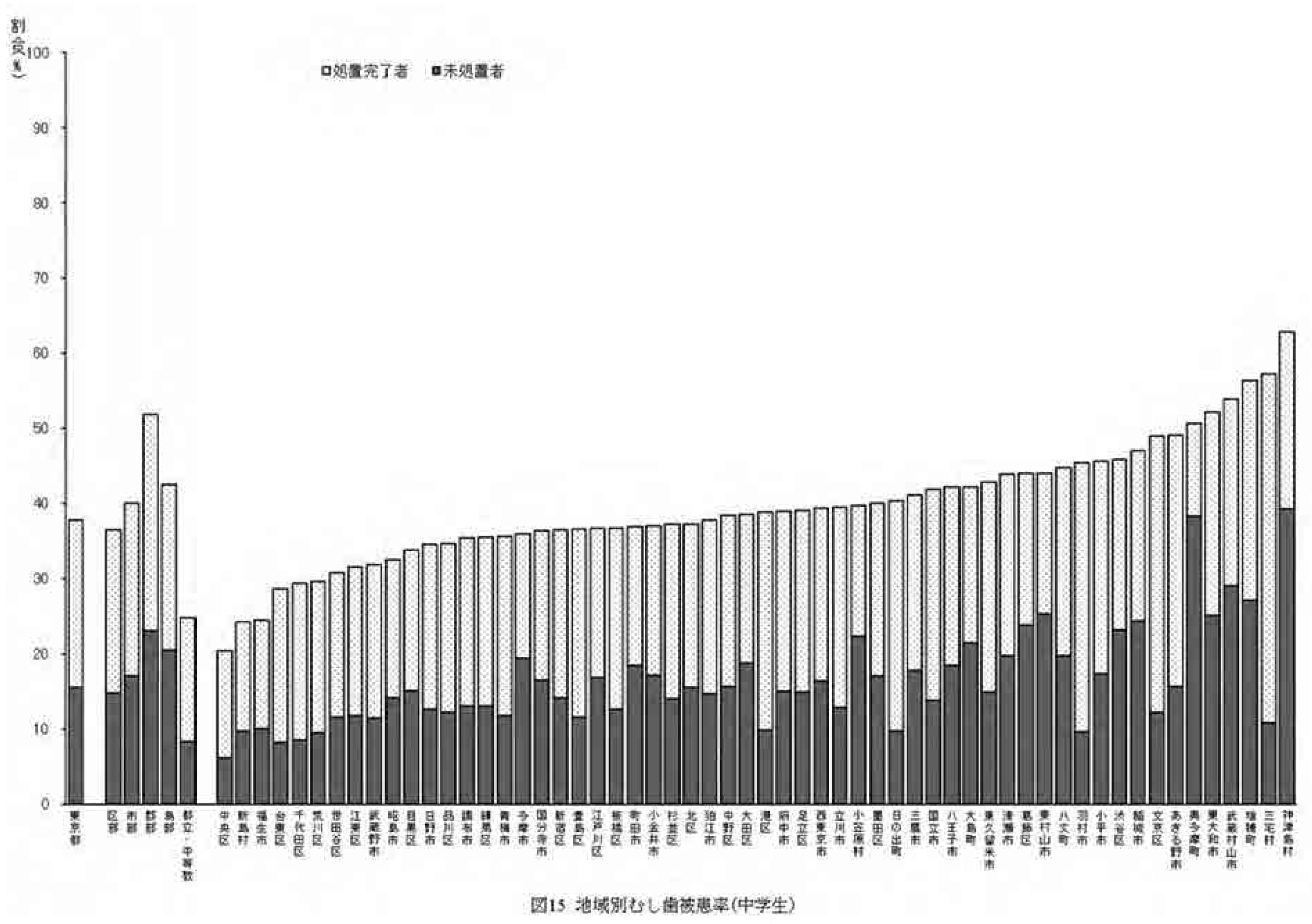 なお、むし歯(う歯)被患率は永久歯だけでなく、乳歯も合わせて集計している。図13 にて11歳の段階で被患率が減少するのは、乳歯から永久歯への生え変わりの影響によるものと考えられる。また、小学校の地域別のむし歯(う歯)被患率を図14 に、中学校の地域別のむし歯(う歯)被患率を図15 にそれぞれ示す。 |