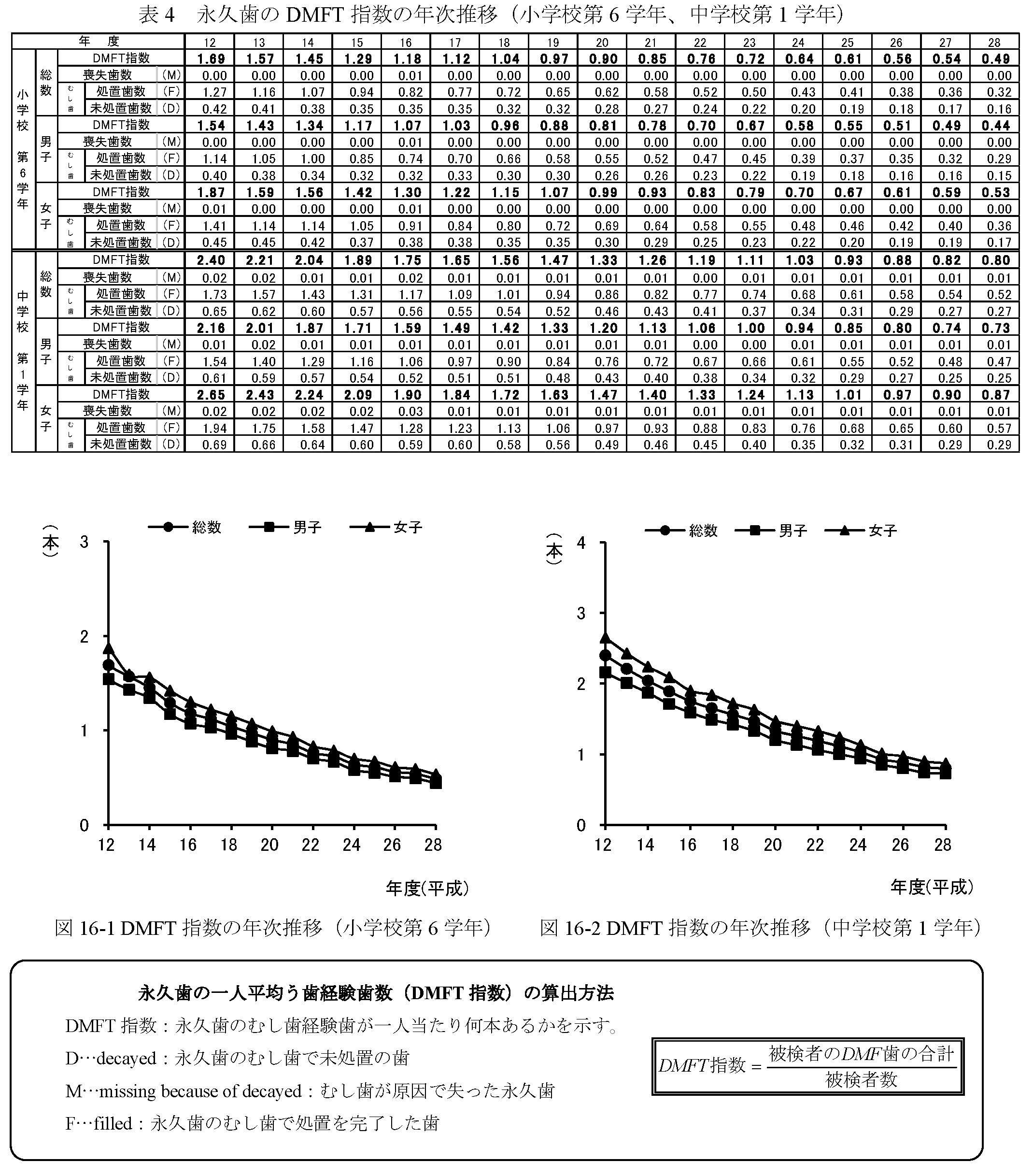 小学校第6 学年児童、中学校第1 学年生徒の永久歯の一人平均むし歯(う歯)経験歯数(DMFT 指数)について(表4、図16-1、16-2、図17)