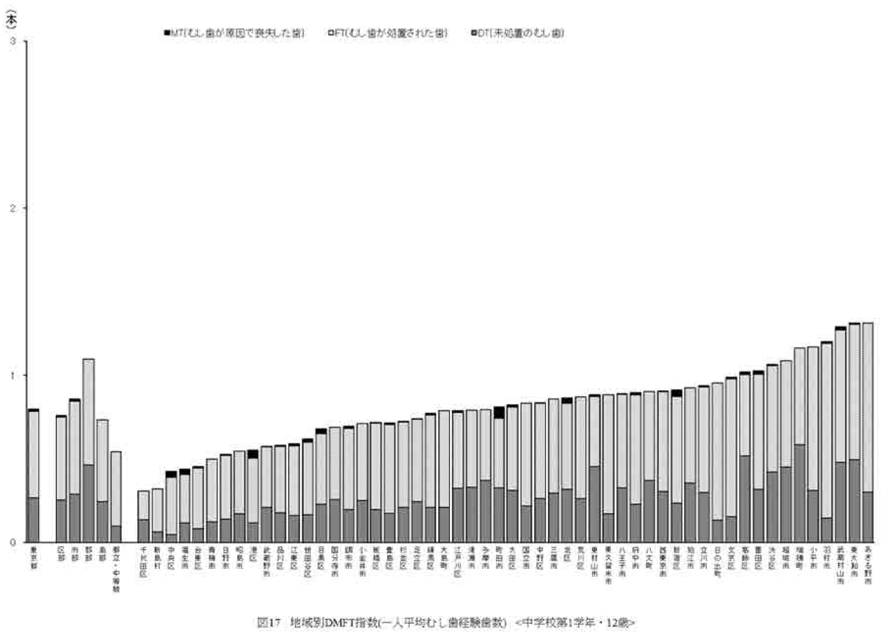 DMFT 指数は、小学校第6 学年、中学校第1 学年、いずれにおいても、男子より女子の方が高くなっている。また、地域別のDMFT 指数(中学校第1 学年)を図17 に示す。 |