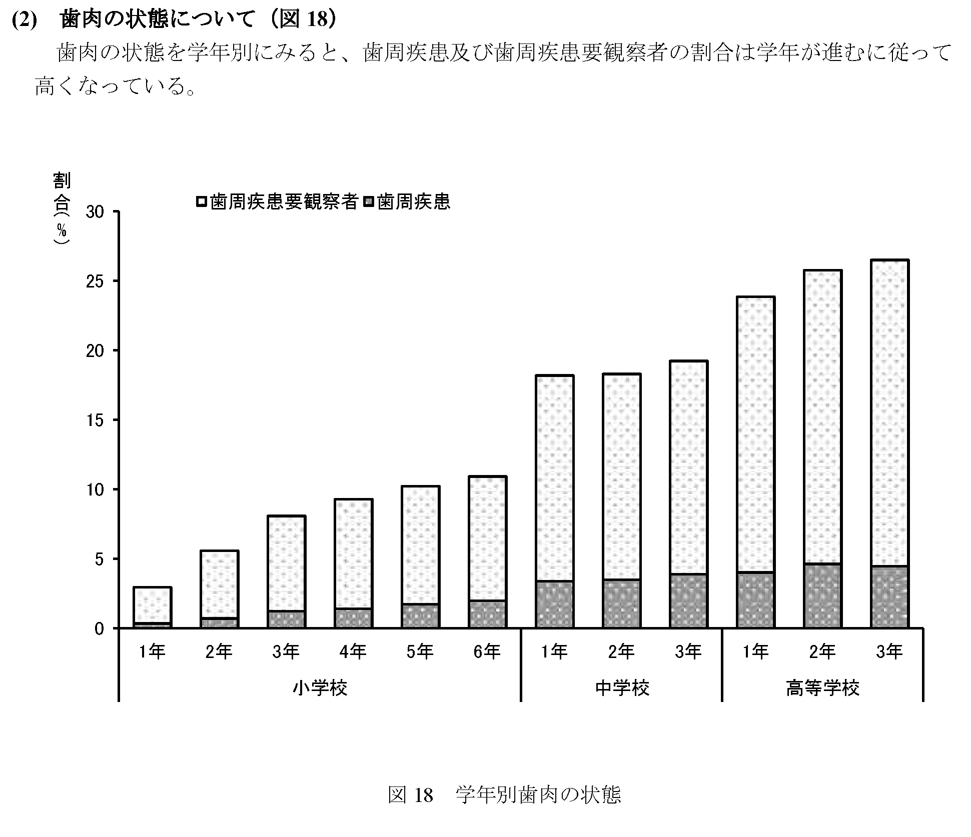 歯肉の状態を学年別にみると、歯周疾患及び歯周疾患要観察者の割合は学年が進むに従って高くなっている。 |