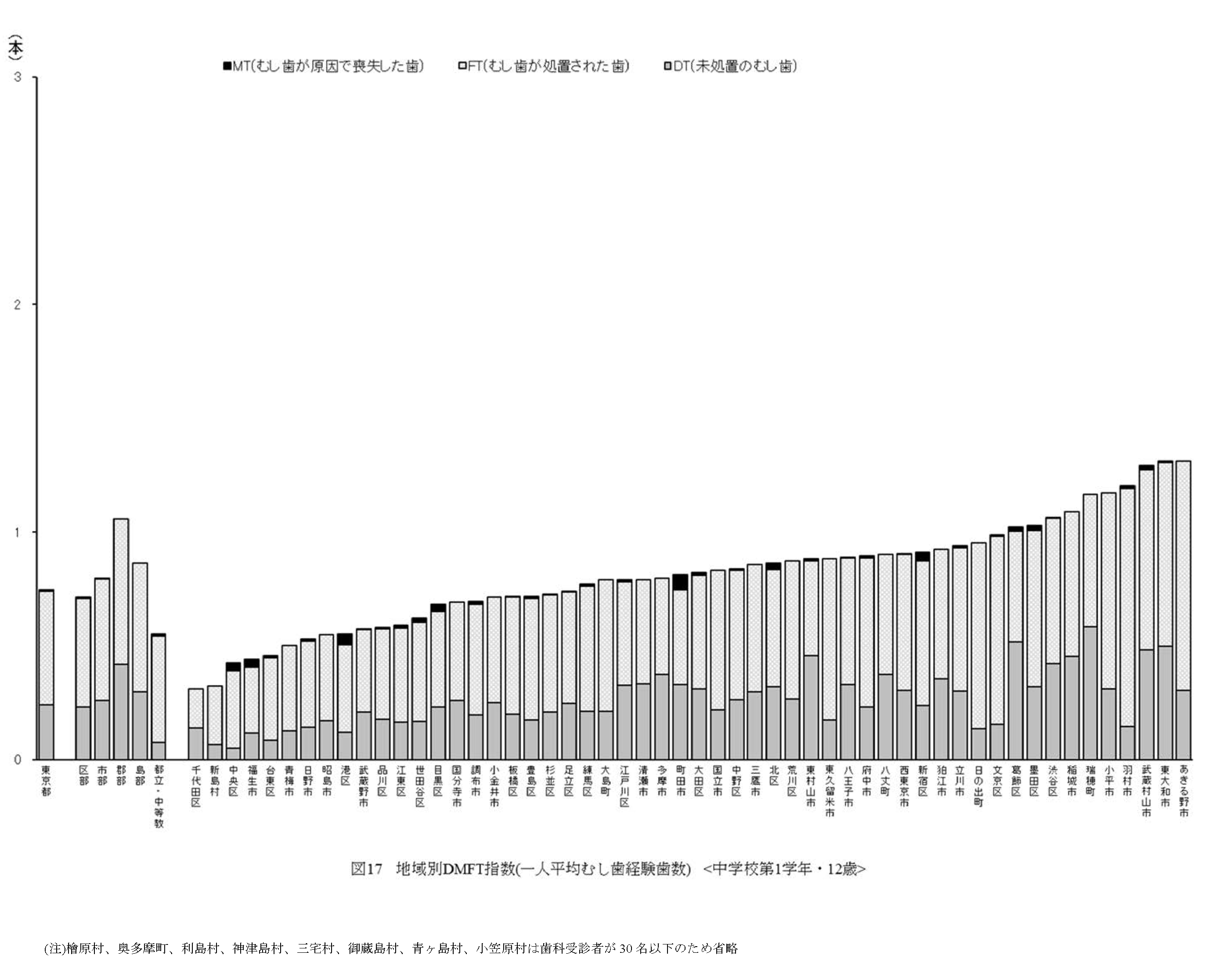DMFT 指数は、小学校第6 学年、中学校第1 学年、いずれにおいても、男子より女子の方が高くなっている。また、地域別のDMFT 指数(中学校第1 学年)を図17 に示す。 |