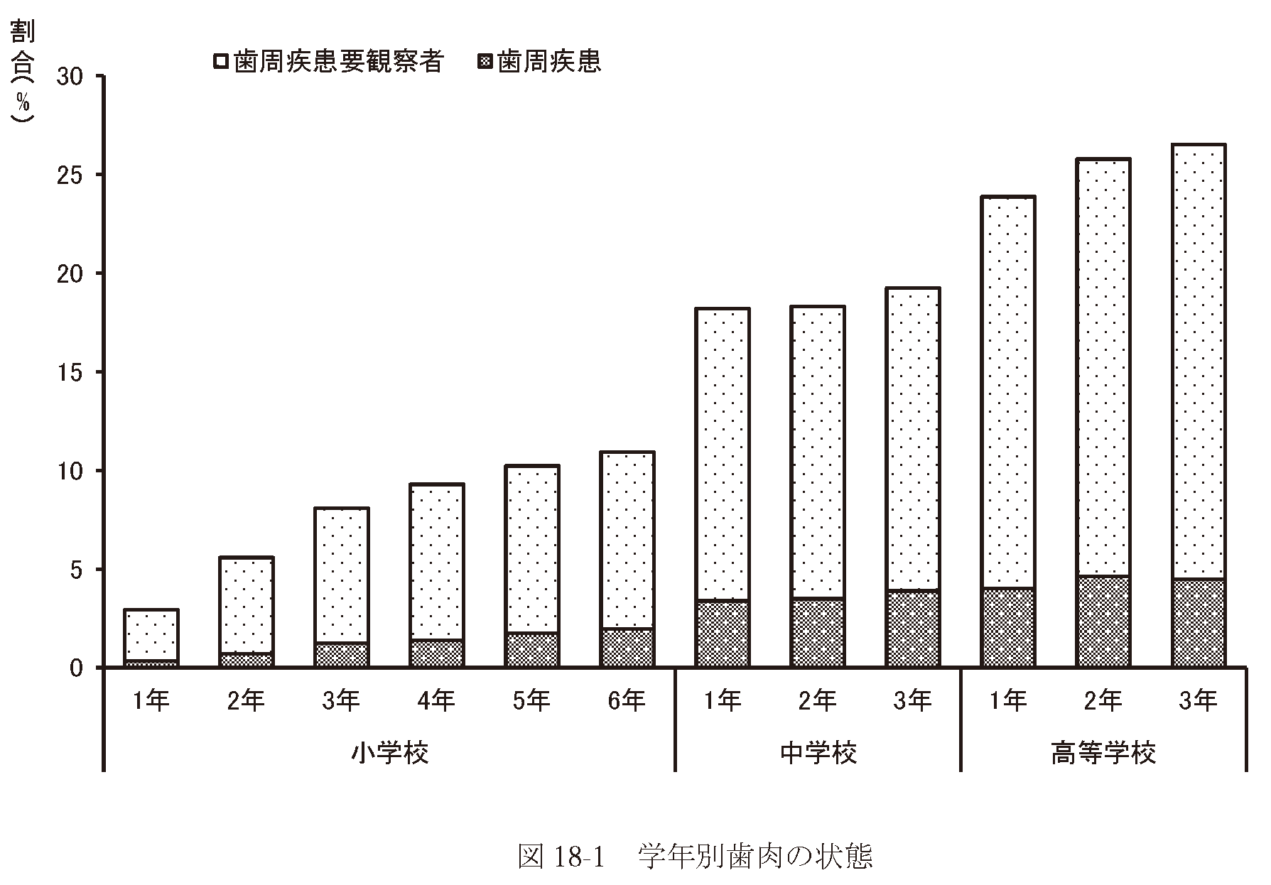 歯肉の状態を学年別にみると、歯周疾患及び歯周疾患要観察者の割合は学年が進むに従って高くなっている。 |